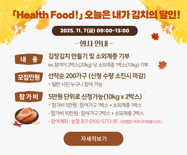 여주시자원봉사센터에서 오는 11월 7일 김장김치 만들기 행사를 진행합니다. 일부는 소외계층에 기부까지 진행하는 행사이니 아래를 참고하시고 많은 참여 바랍니다.